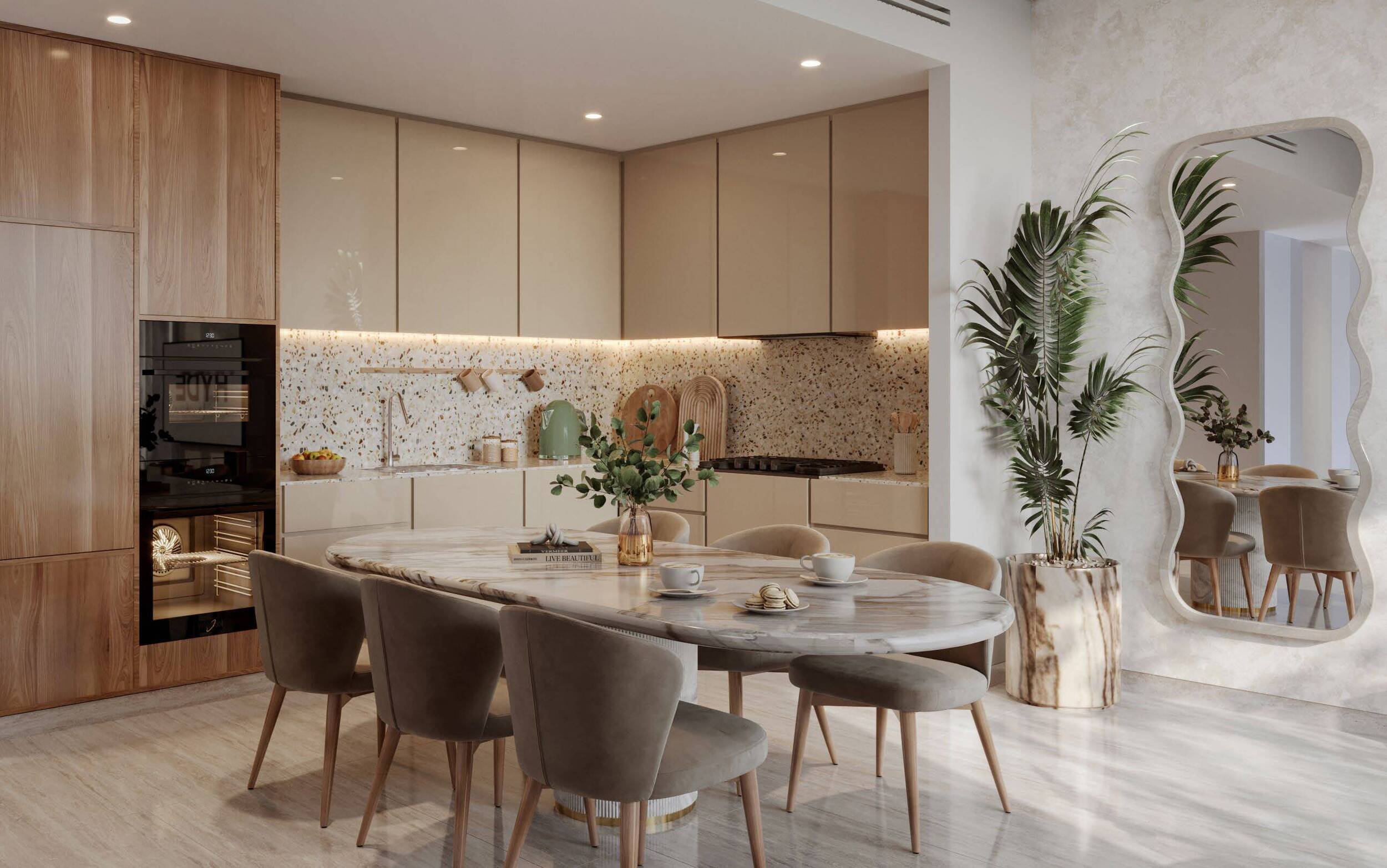 Quartz countertops with terrazzo splashbacks