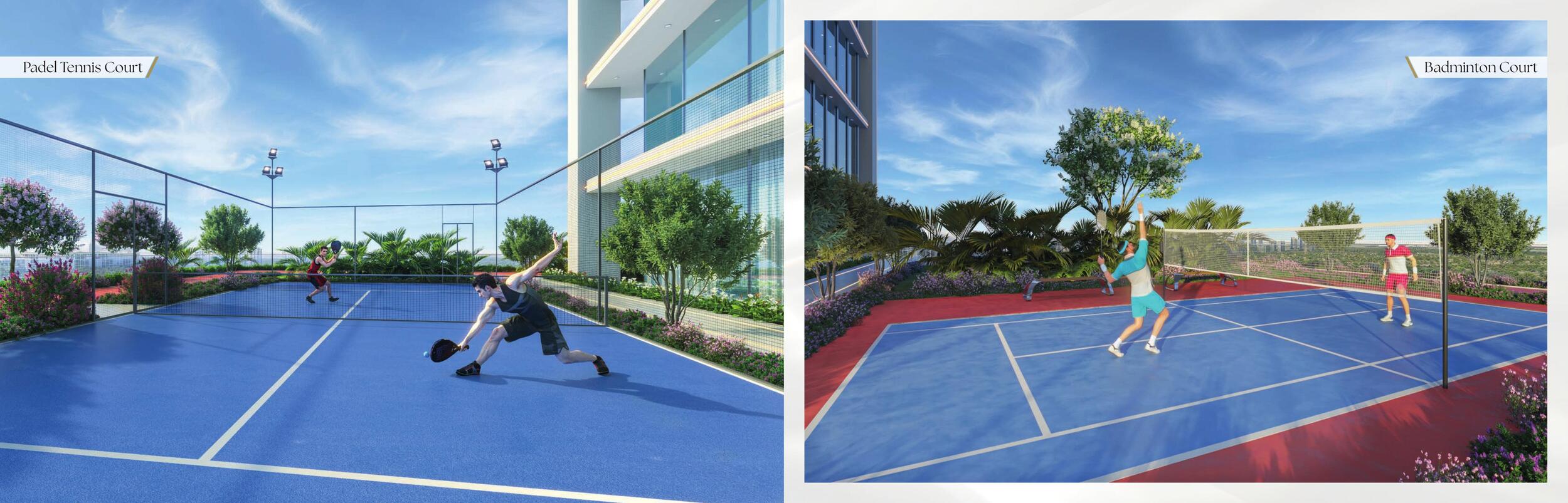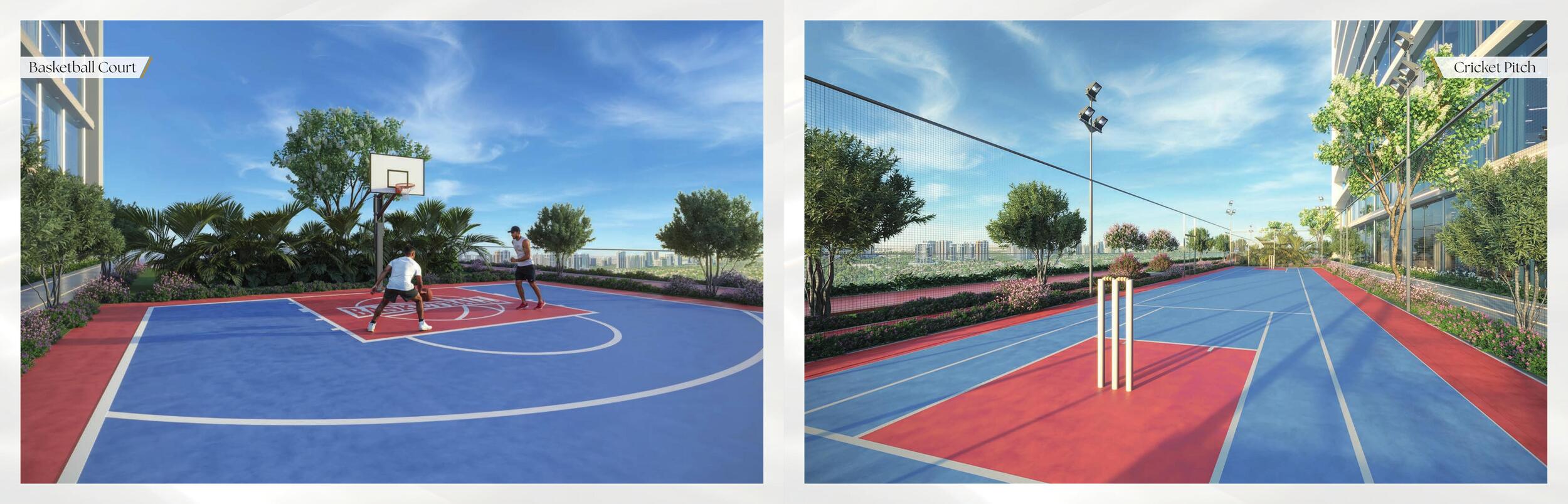 - Cricket pitch, padel court, badminton & basketball courts