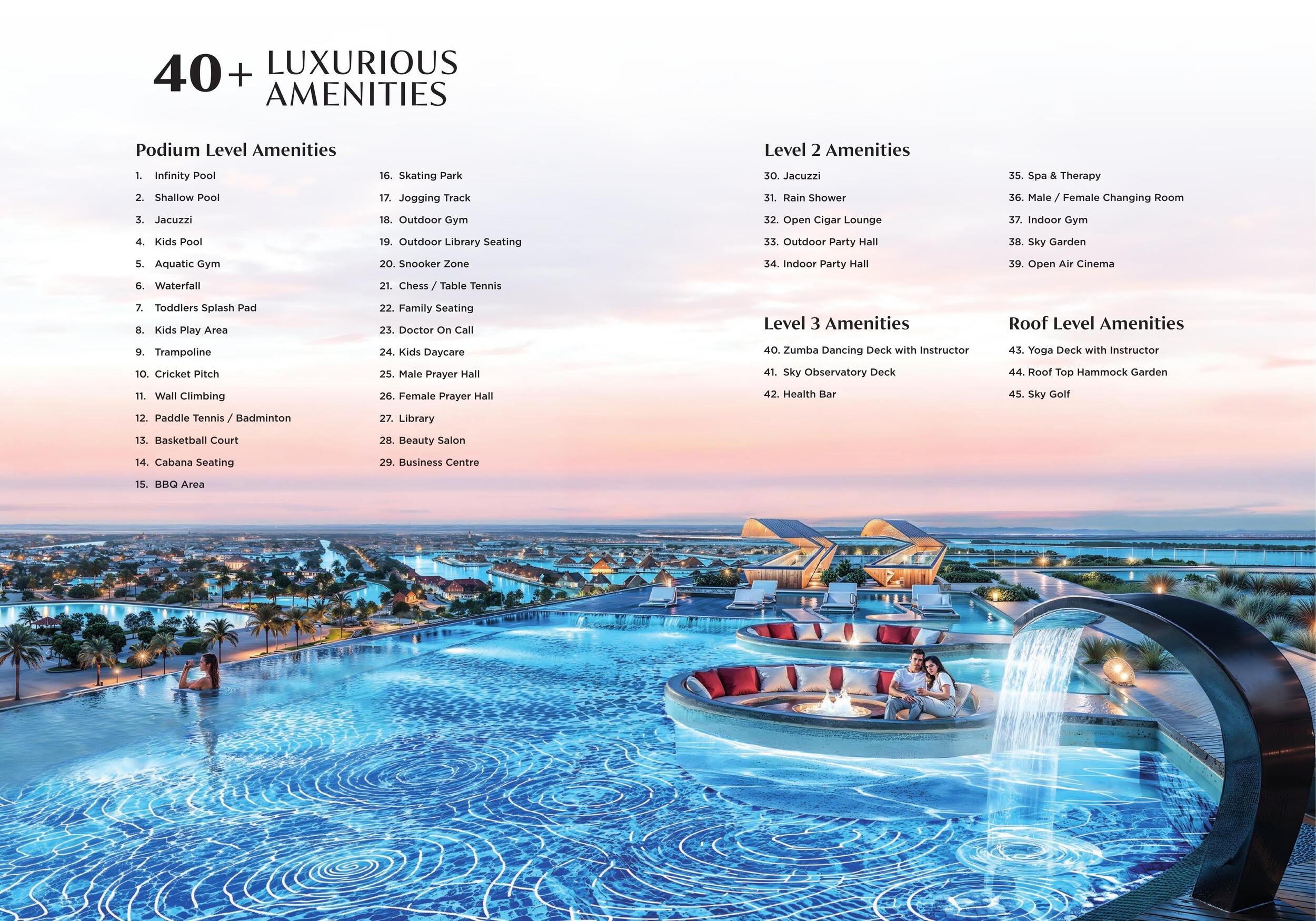 - Infinity Pool, Aquatic Gym, Rain Shower, Rooftop Hammock Garden