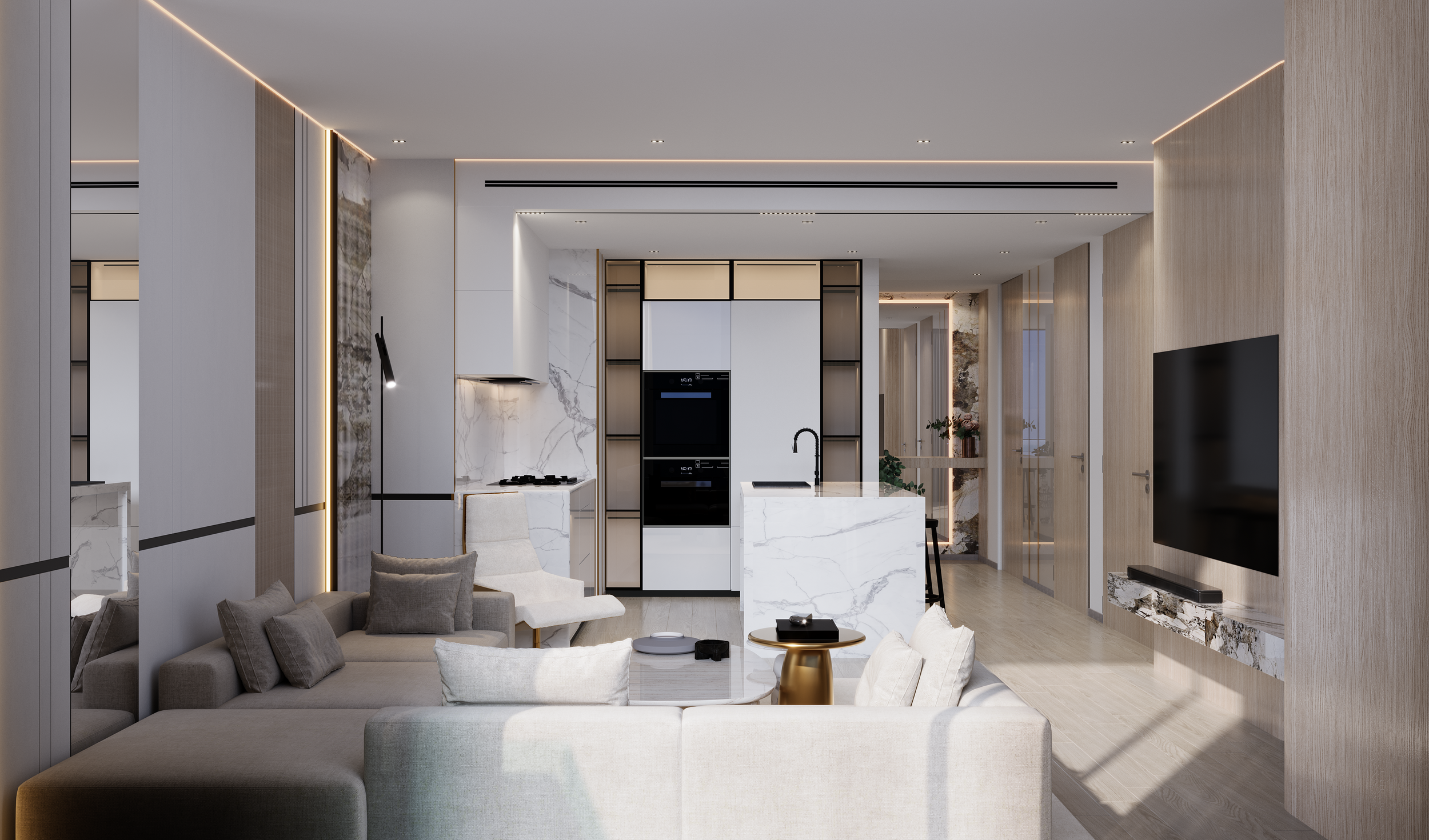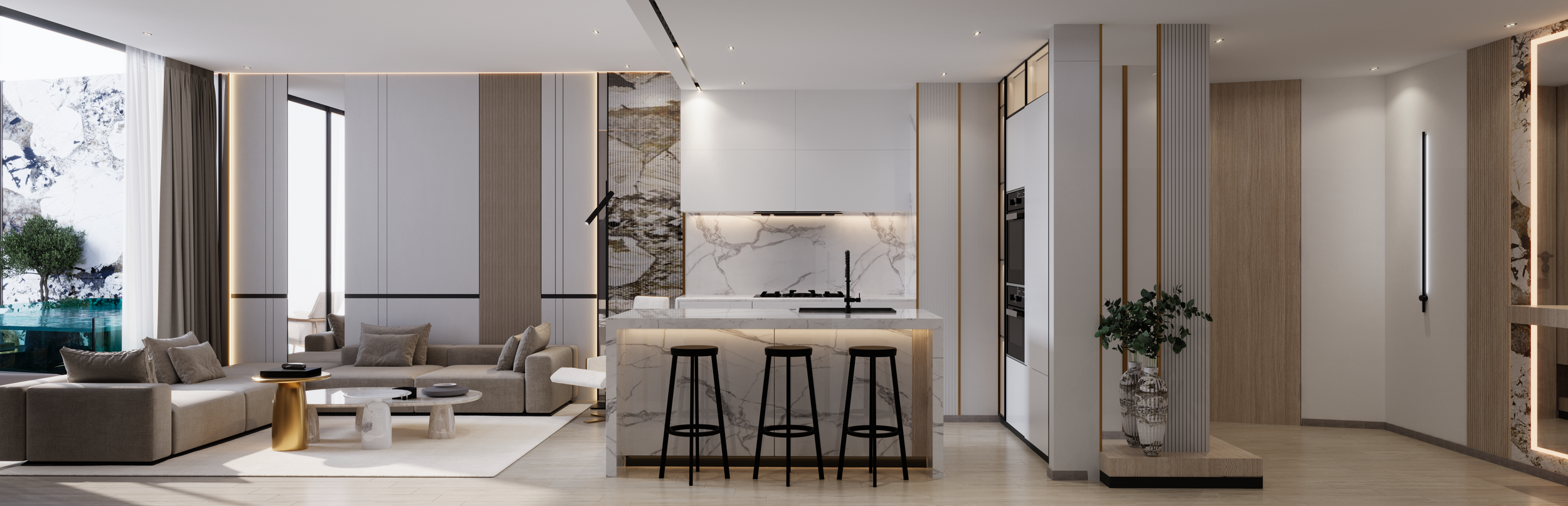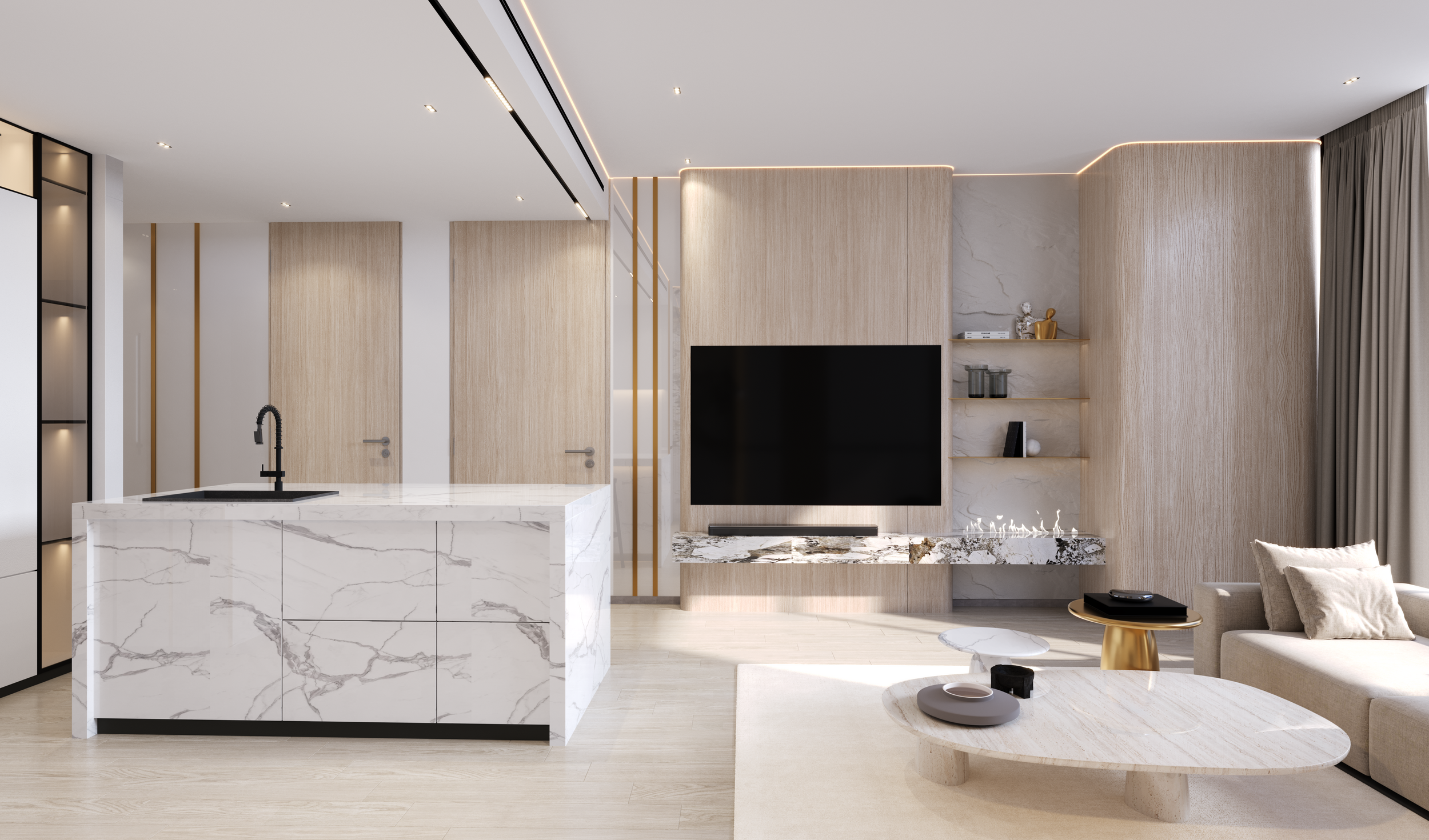 - Premium finishing: Calacatta Oro, Walnut Wood, and Brushed Brass