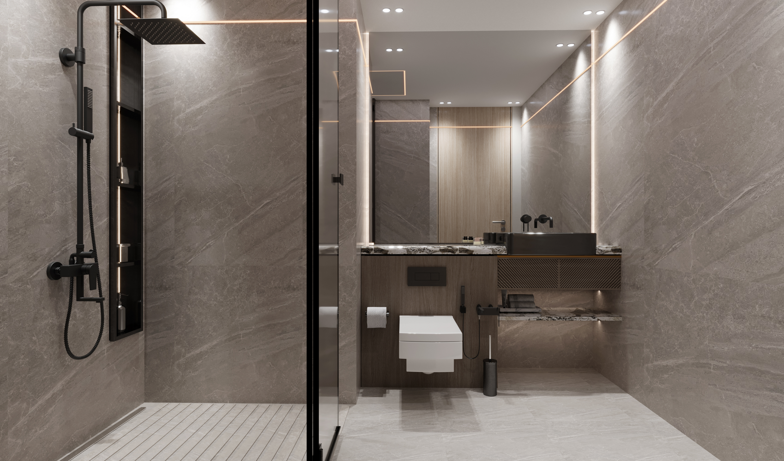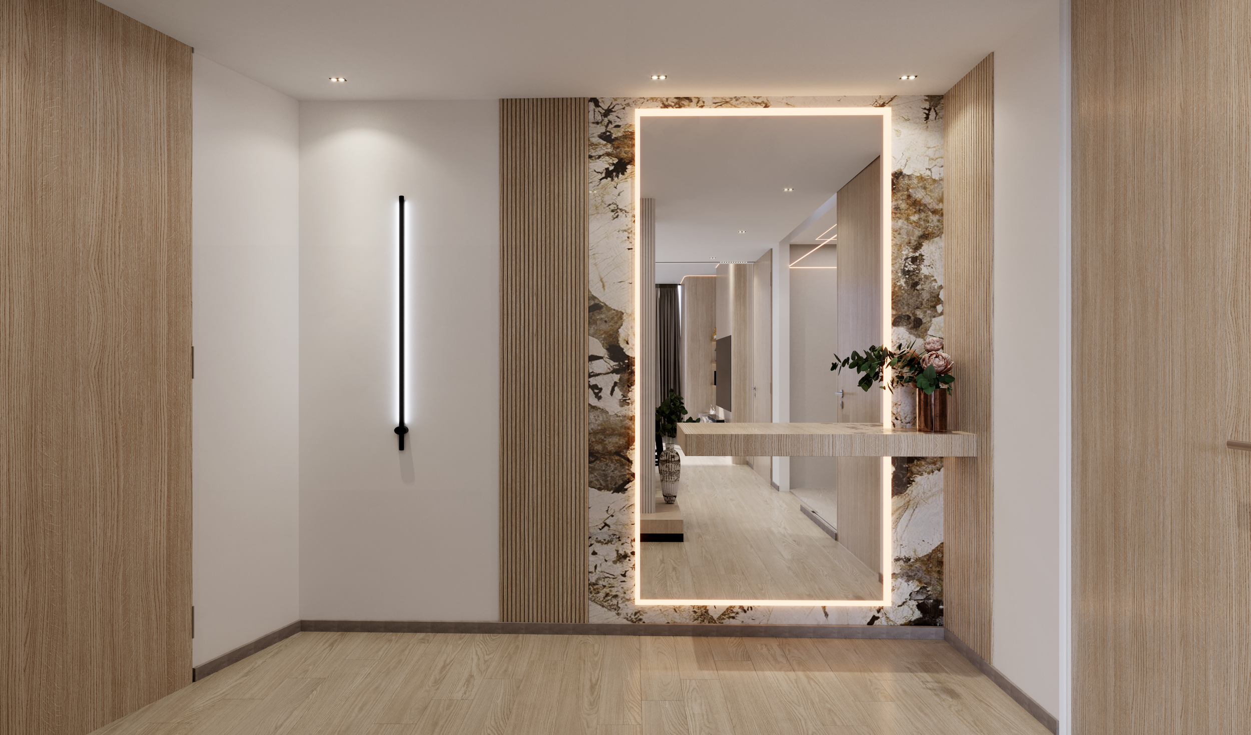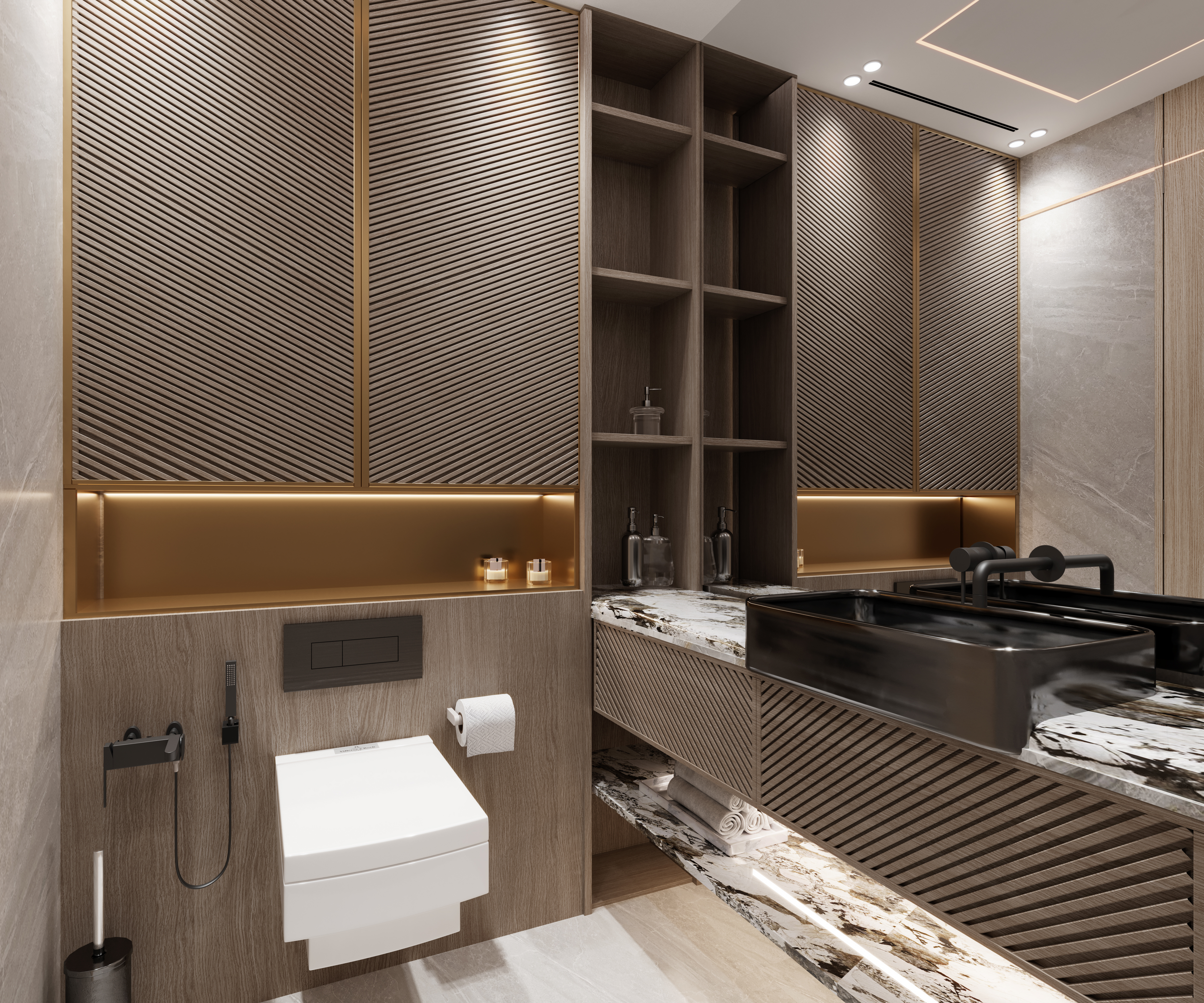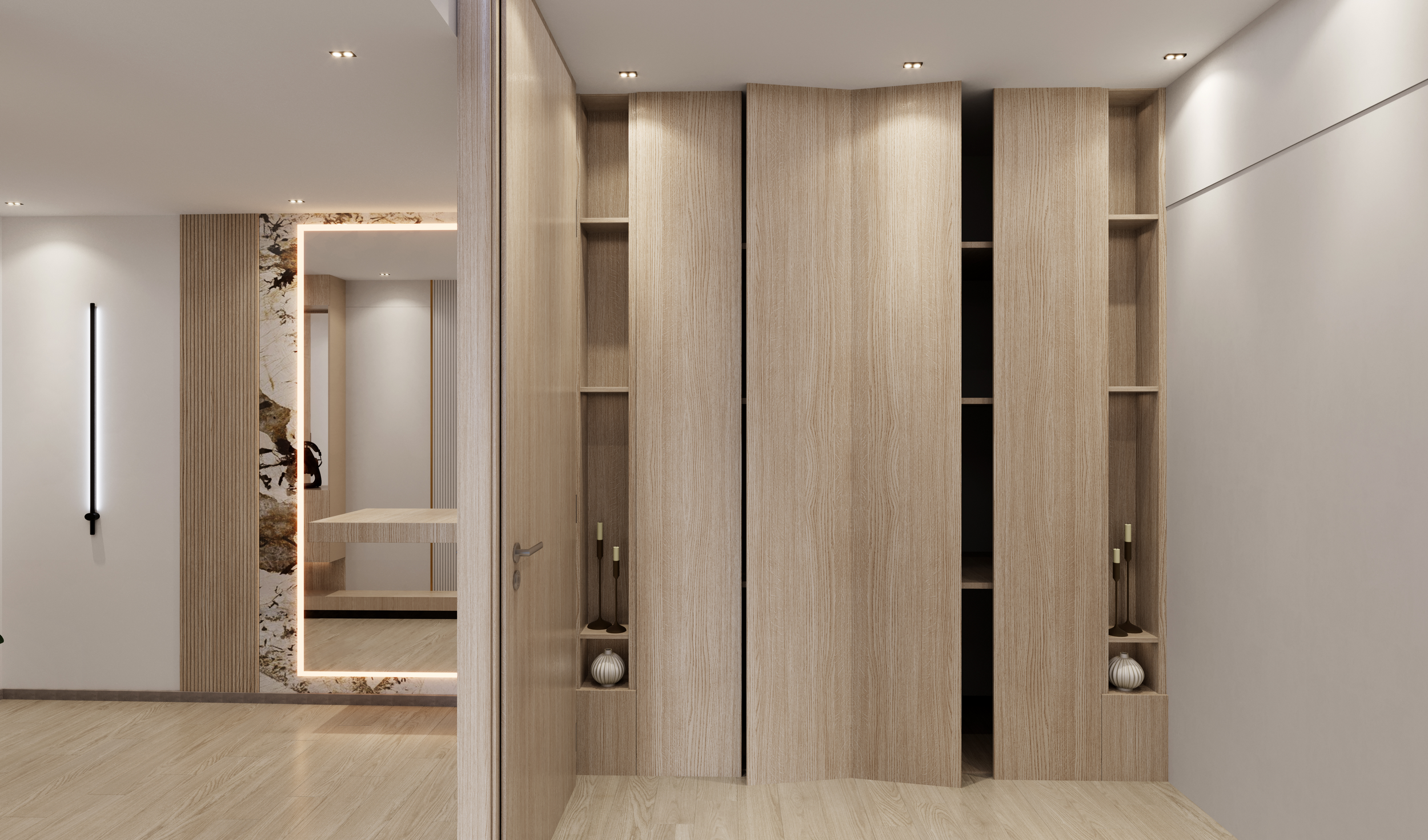 - Premium finishing: Calacatta Oro, Walnut Wood, and Brushed Brass