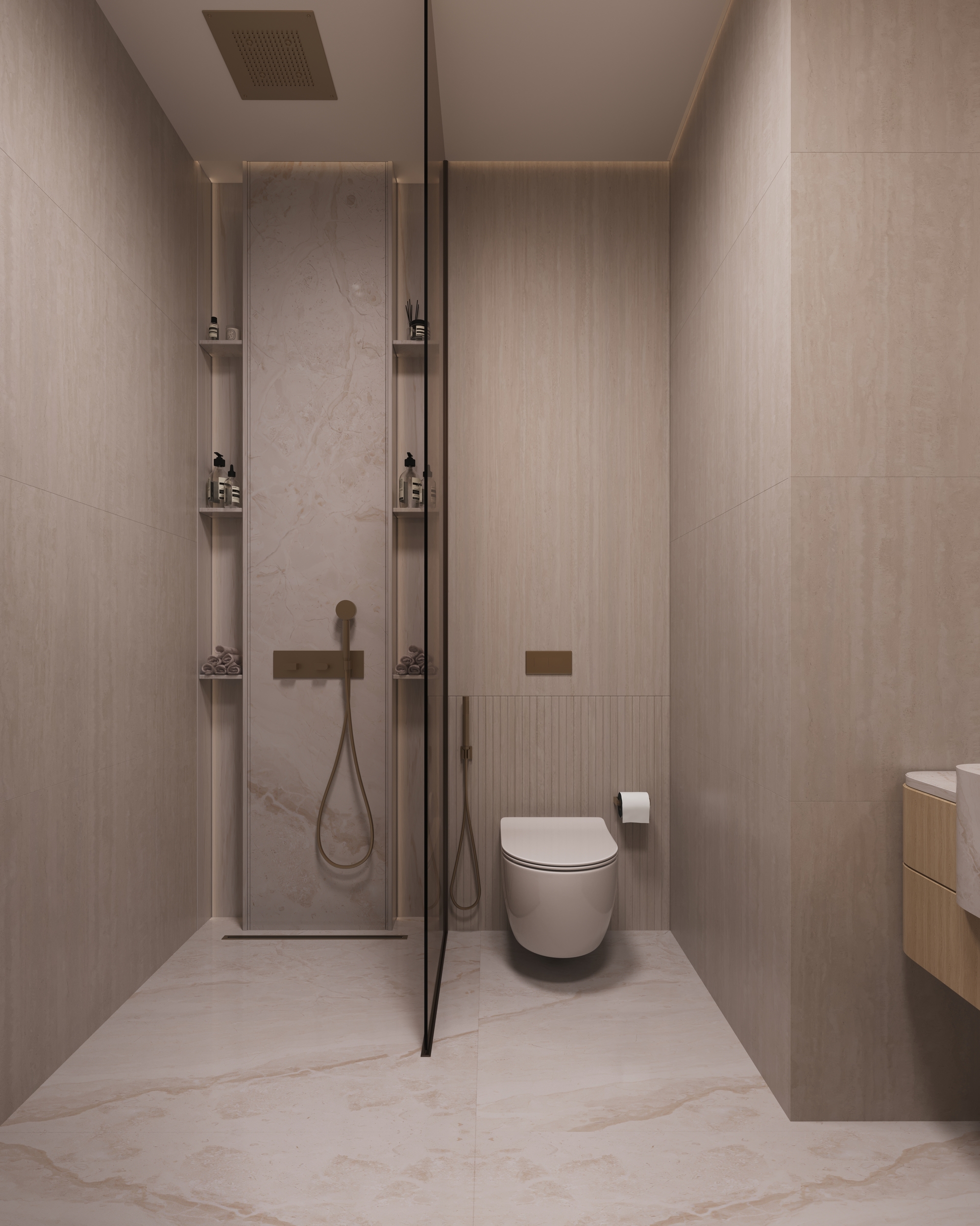 Interiors: Exquisite finishes including marble, natural wood, fluted travertine, champagne metal accents, and premium porcelain tiles.