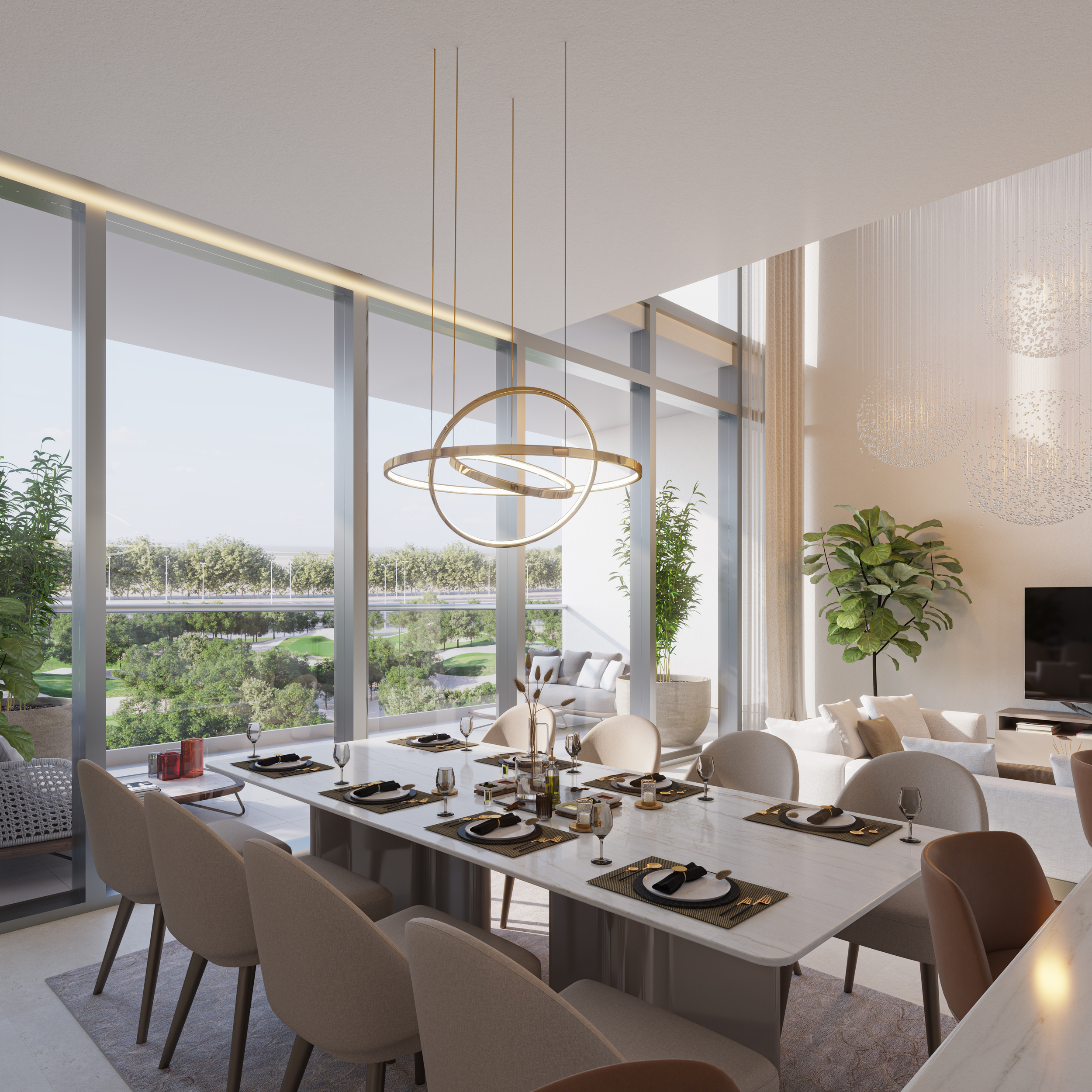 - Floor-to-ceiling windows framing uninterrupted golf and skyline views