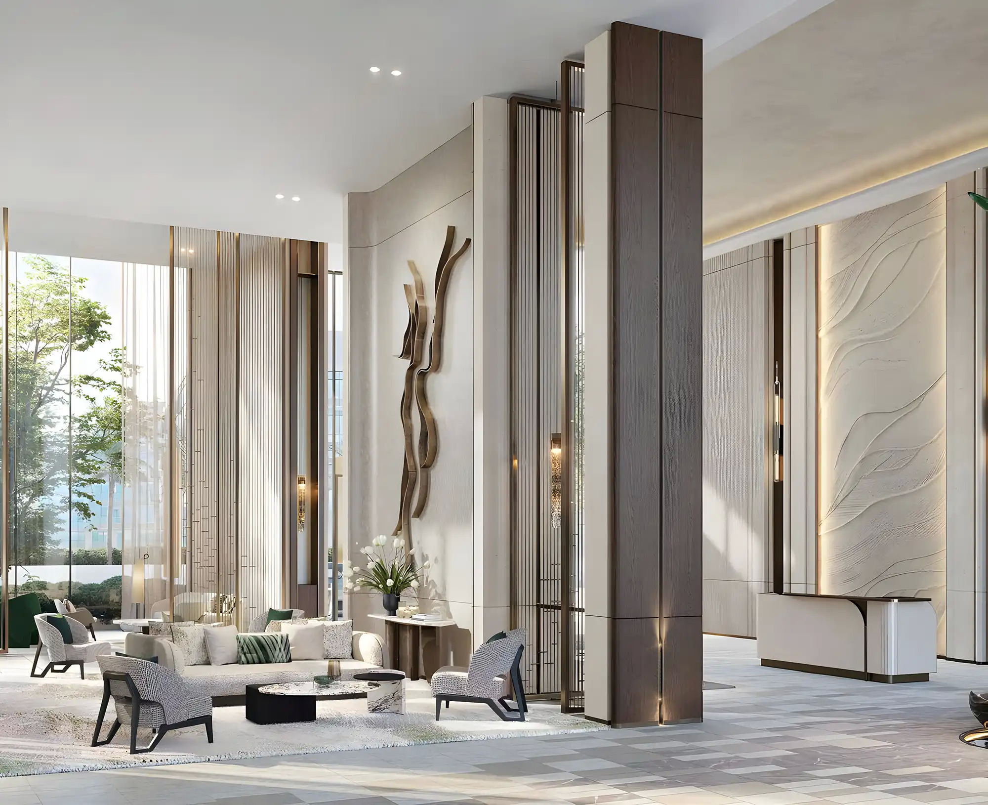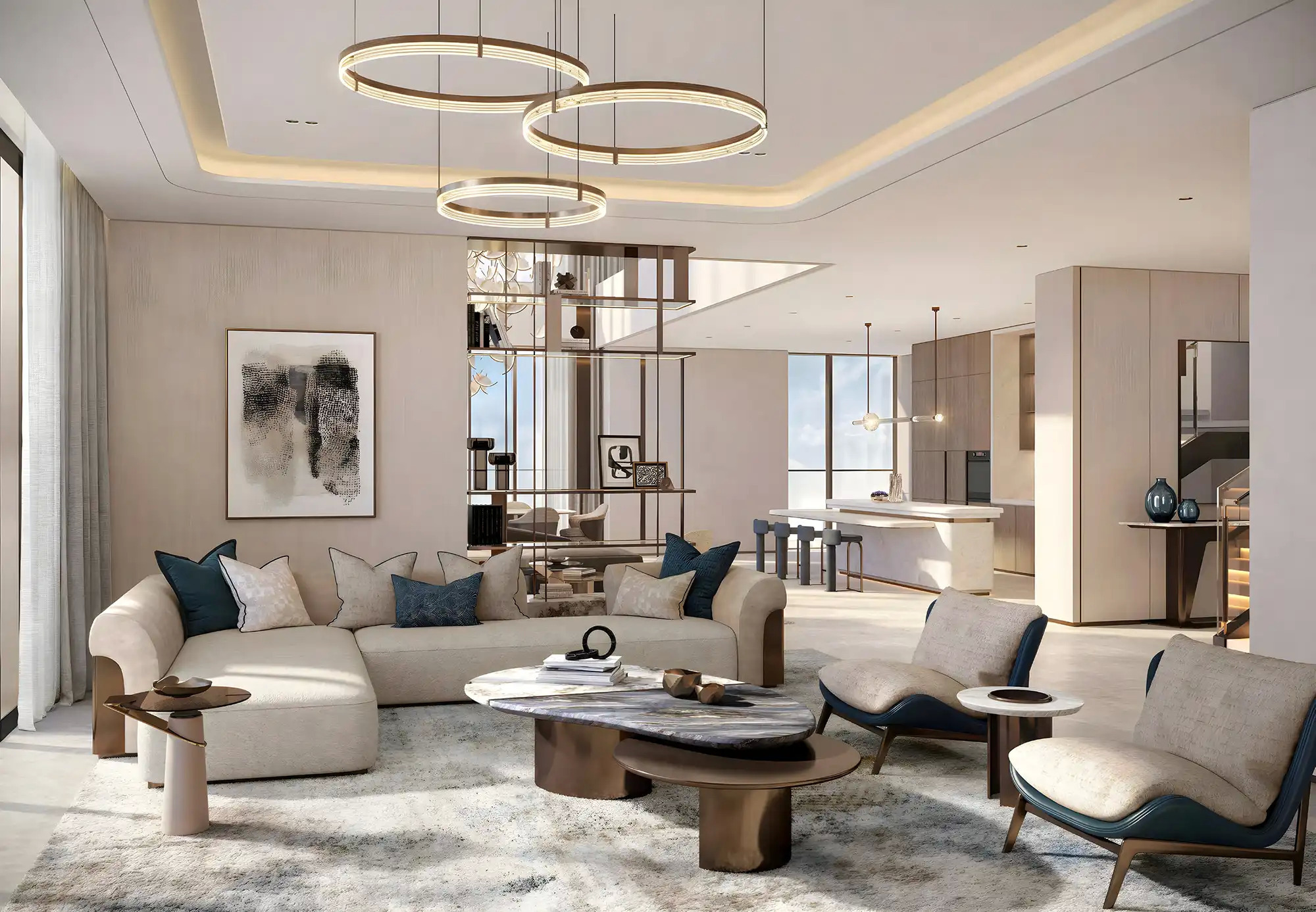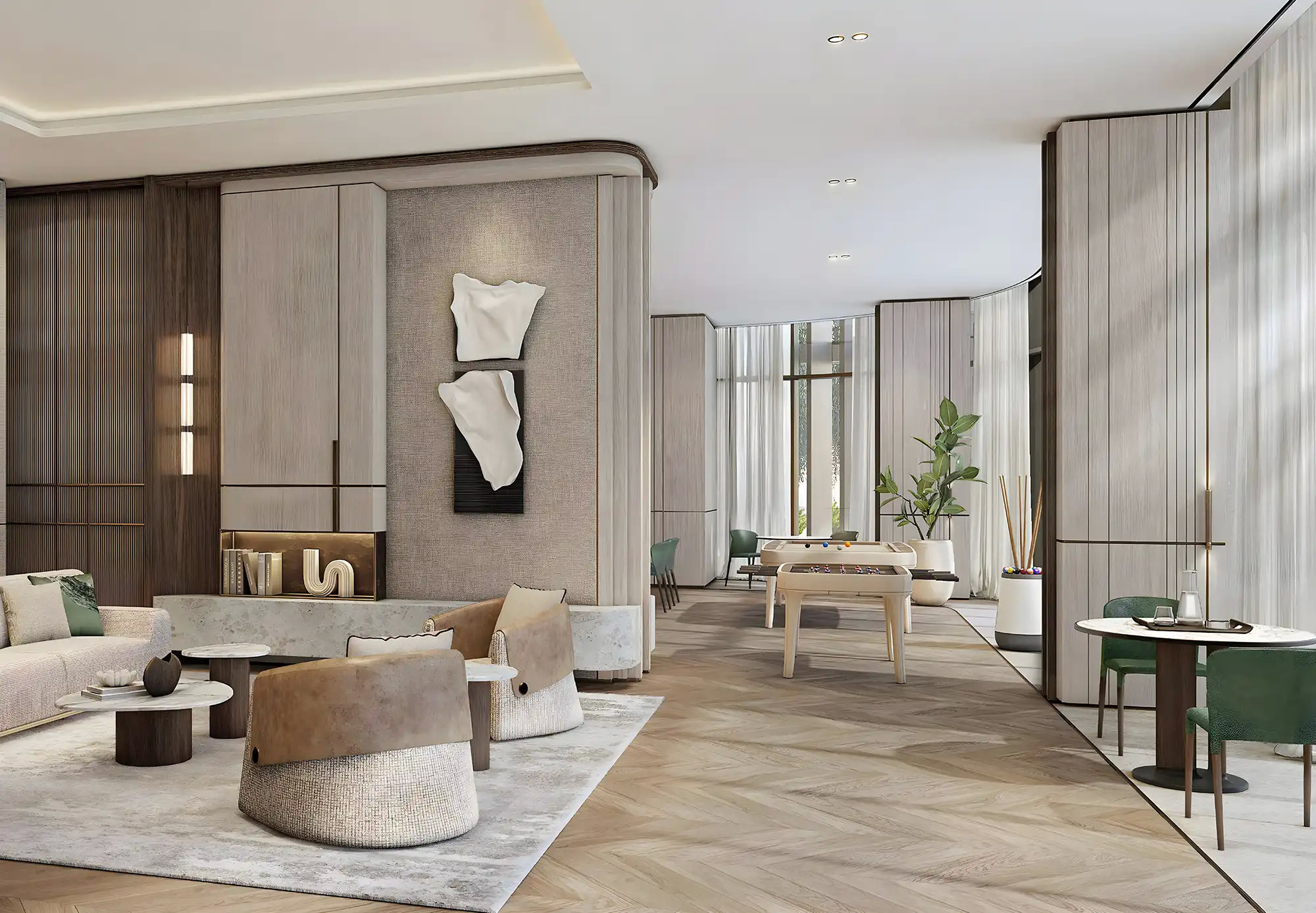 - Thoughtfully designed interiors with organic curves, natural palettes, and bronze detailing