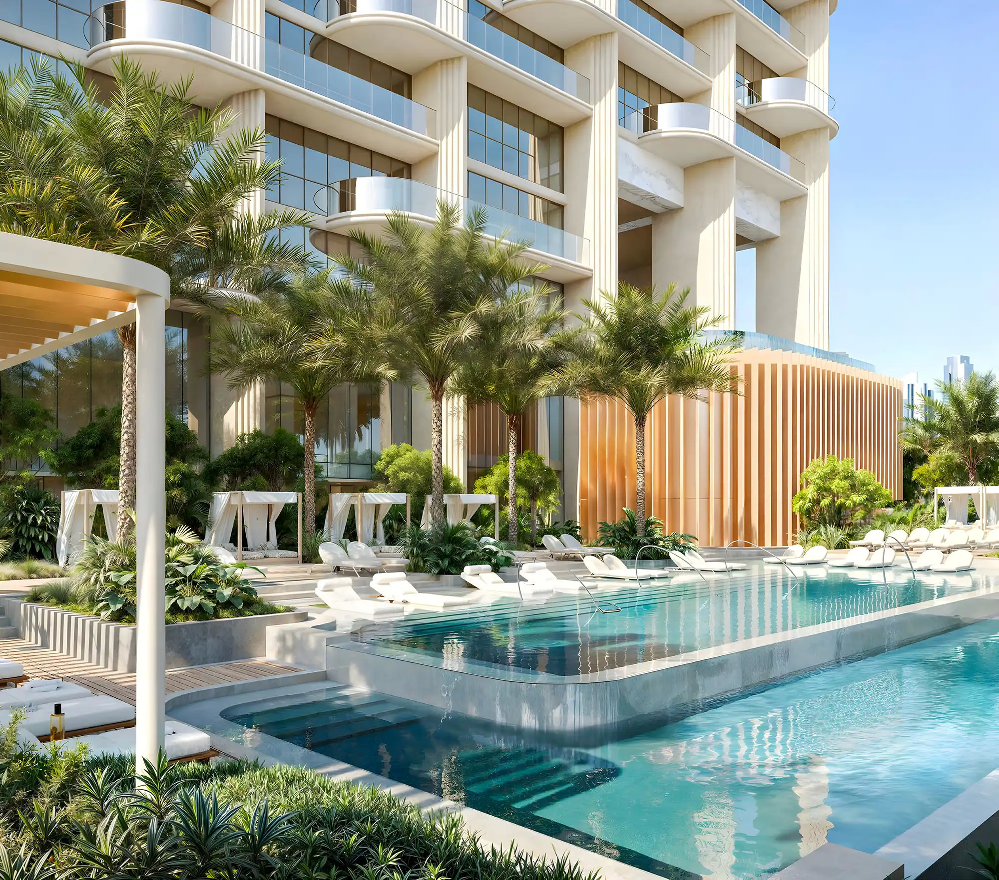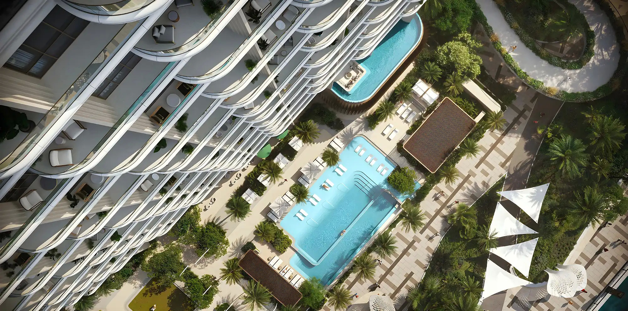 - Resort-style living with cascading pools, infinity pool, cabanas, and private terraces